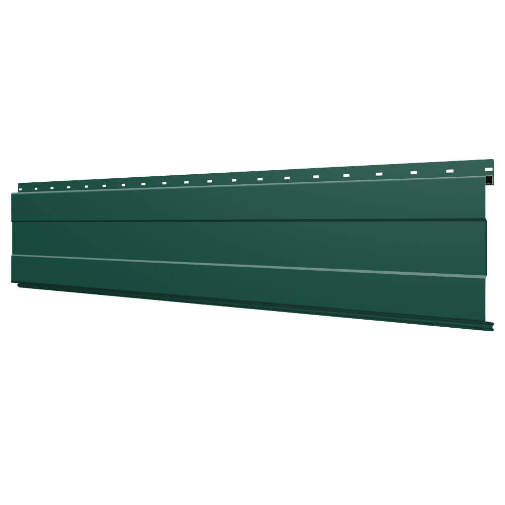 Линеарная потолочно-стеновая панель с ПОЛОСОЙ усиленная цвет RAL6005 Зеленый Мох применяется в качестве софитов для подшивы крыши, наружной и внутренней отделки потолков, стен, фронтонов фасада дома в Костроме.